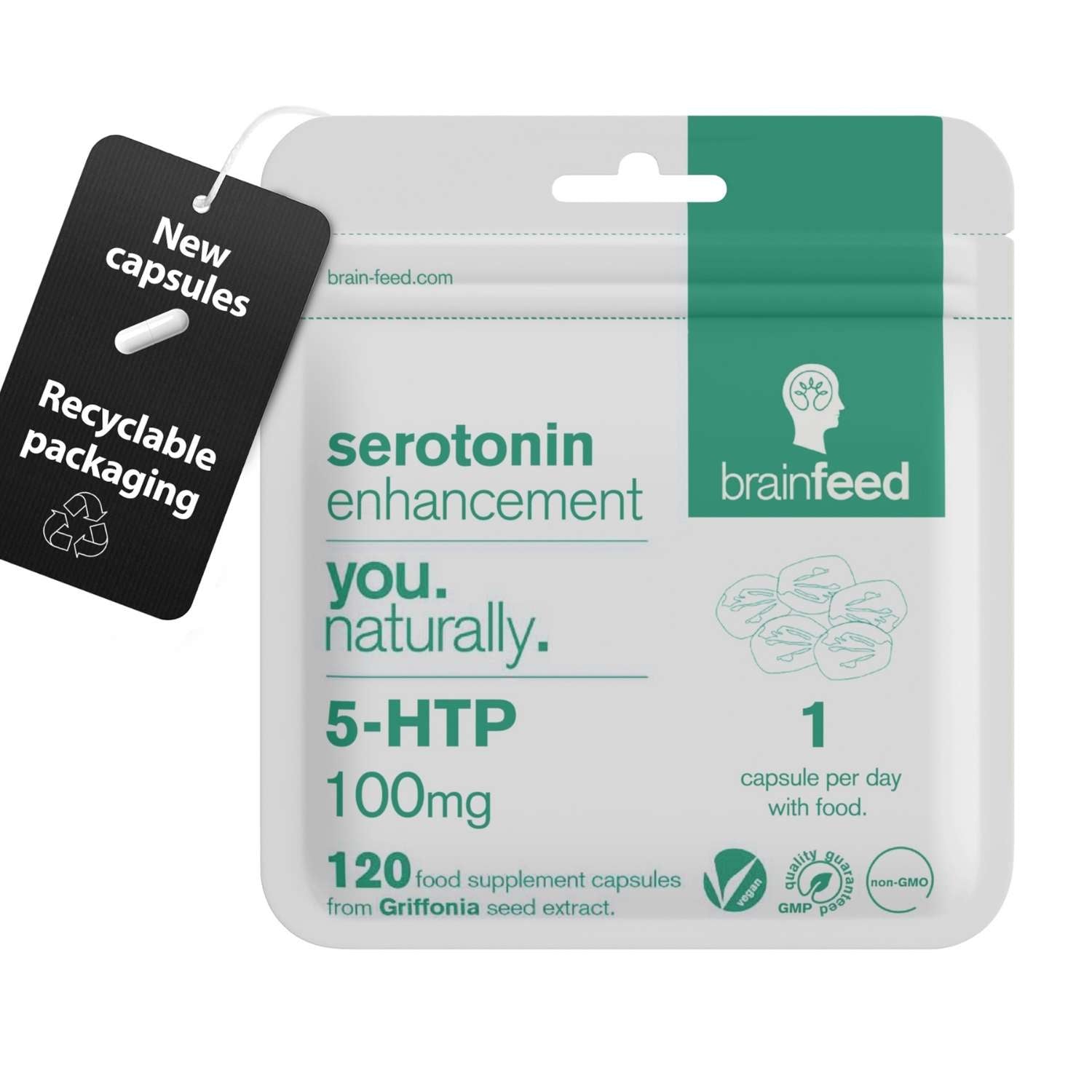 Support your serotonin levels with our natural 5-HTP 100mg capsules extracted from Ghanaian-sourced Griffonia seeds. 5-HTP is the essential building block to your feel-good chemical messenger, serotonin (5-HT). Serotonin plays a crucial role in regulating positive mood[1]. At night, serotonin is converted into melatonin to aid restful sleep[2,3].